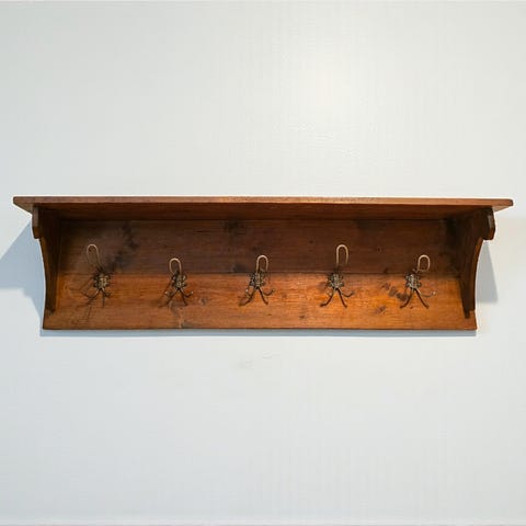 Kauniisti patinoitunut, puinen antiikkinaulakko hattuhyllyllä. Naulakko on todennäköisesti peräisin 1900-luvun alkupuolelta. Metalliset koukut seinäkiinnitystä varten.