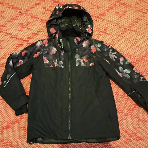 Myydään toppatakki. Takki käyttö kunnossa, edessä tahraa mikä ei ole lähtenyt pesussa( näkyy kuvassa). Takin alimman napin alaosa on irronnut.