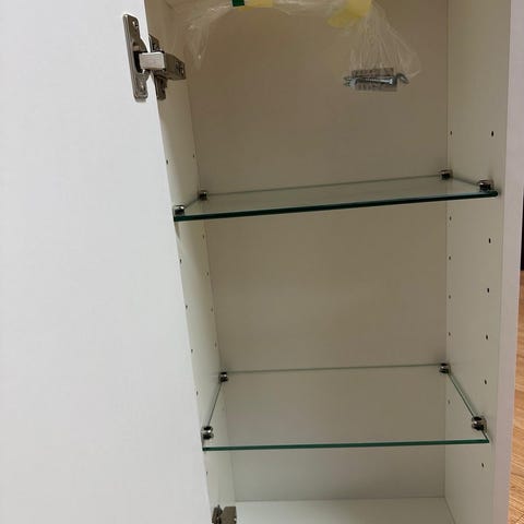 Käytetty valkoinen peilikaappi, jossa kaksi ovea ja kaksi lasihyllyä.