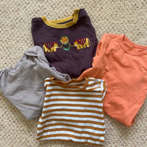 Nellille tekemä body Gugguun eukalyptus kankaasta. Tässä niskassa paikattu reikä, josta lisäkuva. Muita moitteita en löydä vaatteista.
