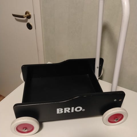Brio lasten työntökärry, jossa on punainen ja keltainen runko sekä valkoinen työntöaisa. Kunto hyvä.