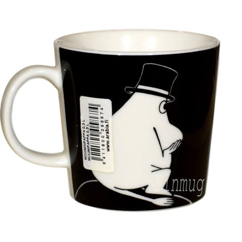 Tämä erityinen Muumipappa-muki on yksi Arabian suosituimmista muumimukeista. Muki esittelee kaksi ikonista kuvaa: toisella puolella Muumipappa leppoisasti ongella ja toisella hän tuumiskelee. Mielenkiintoista on, että mukin alkuperäisissä tarroissa luki pelkästään "Muumipappa-musta", kun taas myöhemmissä "Made in Thailand" -tarroissa on kuvaavampi nimi "Muumipappa tuumiskelee".
