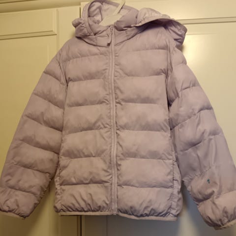 Uniqlo-merkkinen ihanan kevyt ja lämmin kevyttoppatakki koossa 120. Taskut ja irrotettava huppu. Kunto moitteeton.