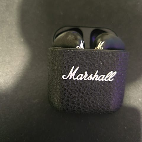 Marshall Minor 4 langattomat kuulokkeet musta värinen. Kuulokkeet ovat korvan sisäiset ja langattomat, mukana latauskotelo. Kuulokkeissa on musta nahkainen ulkokuori.