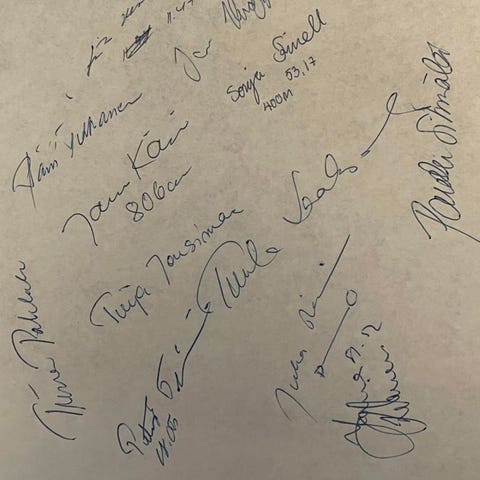 Vihko jossa nimikirjoituksia Ounasvaaran talvikisoista 1950-luvulta. Pääasiassa urheilijoiden mutta myös siellä esiintyneiden taiteilijoiden. Mm. Siiri Rantanen, Antti Hyvärinen ja kymmeniä muita. Voi tarjota. Kuvissa pari esimerkkisivua. Voin postittaa.