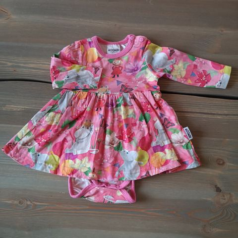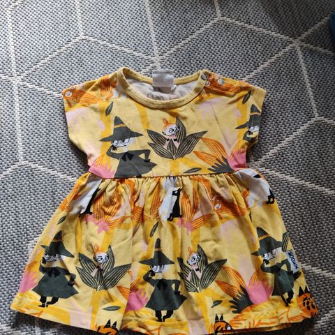 Kaunis muumimekko, ollut vähällä käytöllä yhdellä lapsella. Vaaleassa kauluksessa hentoa tummentumaa, ei näy yleisilmeessä juurikaan muuta kuin silloin kun tarkkaan katsoo läheltä.