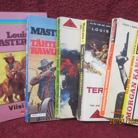 HUOM! toimimme vain postin kautta. Louis L'Amour Pokkareita Jokaisesta Louis Lamour lännen pokkarista on erikseen KUVA / ESITTELY / HINTA. Pokkarit lähetetään Postin helpostikuorella kuoreen mahtuu kaksi pokkaria kirjeen paksuus saa olla maksimissaan 3cm. Jos enemmän kohteita, niin lähetys Postin S-pakettina seurannalla jolloin samaan pakettiin mahtuu pokkareita/kirjoja 25kg saakka. Lisäkuvia, Kysymyksiä ja asiallisia paketti tarjouksia voi myös esittää niistä voidaan aina neuvotella.
