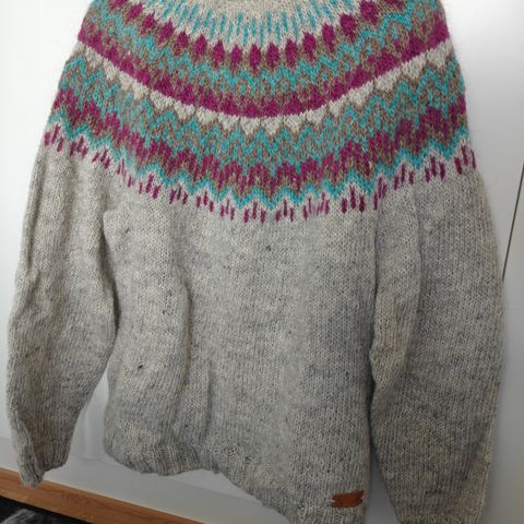 Kaunis harmaa pohja, kuvioissa turkoosi, keltainen, tummanpunainen ja valkoinen