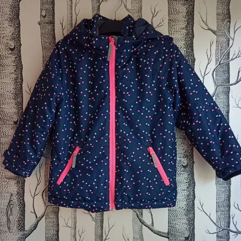 Harmaa toppatakki vaalean punaisella vuorella, koko 110. Vetoketjusta puuttunut yksi hammas jo uutena, ei ole haitannut käyttöä (kuvassa). Hupussa olevat korvat heijatseina.
