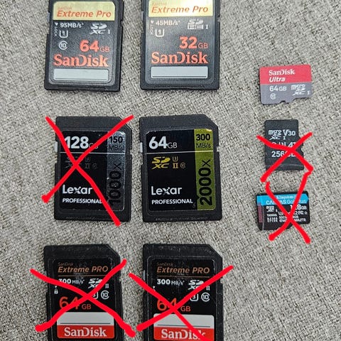 Kortit toimivat täysin normaalisti ja ne on testattu kuvaamalla pari kertaa täyteen joulukuussa 2025. Pientä kulumaa ja käytön jälkeä on, mutta ei mitään suurempaa kosmeettistakaan haittaa löydy.