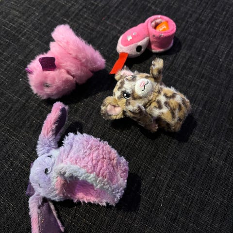 Kolme pehmeätä huopa eläimenpäätä ripustuslenkeillä. Flamingo, tiikeri ja pupu. Pupunkorvat muotoiltavissa sisäisen rautalanka rakenteen avulla.