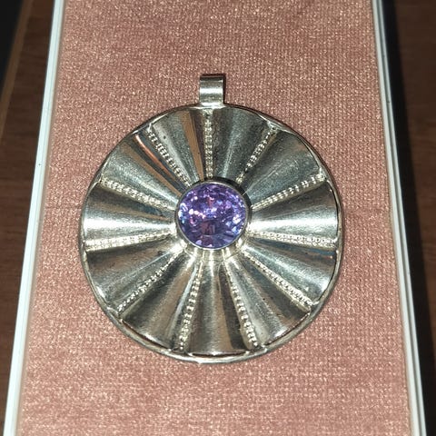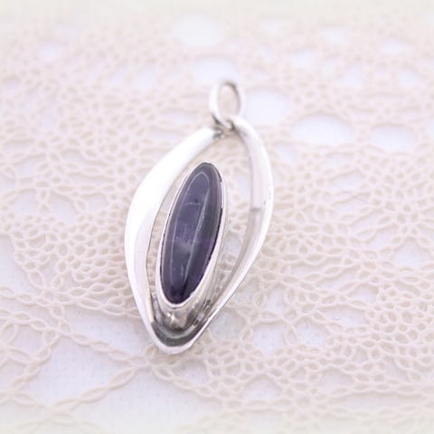 Ontto hopeariipus käsityötä, korkeus 32 mm, 925-leima. Kivinä tummia ametisteja.
