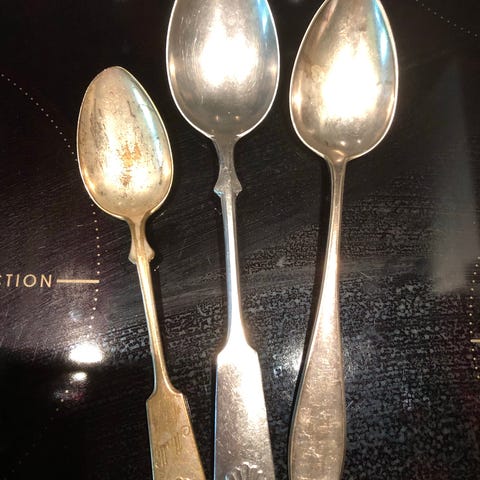 1. Lusikka 16,5 cm, teksti Matti, merkintä Alp, kulunut pinta, Muslan kuvio,