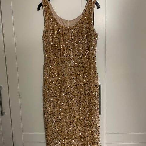 Kultakimmellysmekko vain sovitettu. Koko 40. Vetoketju takana. Toinen saman tyylinen. Hinta 20€+ posti seuranalla noutokin käy.