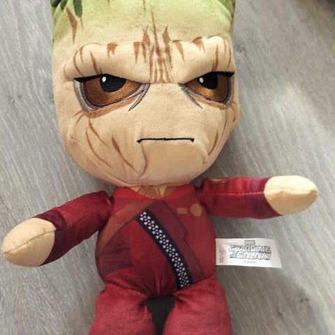 Marvel Guardians of the Galaxy pehmolelu. Pehmolelu, jossa harmaat ja oranssinpunaiset yksityiskohdat, noin 45 cm korkea. Sopii lasten leikkeihin ja keräilyyn. Erittäin siisti kunto.