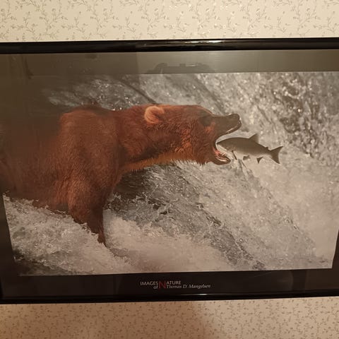 Maalaus, jossa on esitetty karhu talvisessa maisemassa auringonnousun aikaan. Teos on kehystetty puukehykseen. Kangaspohjainen maalaus, jossa näkyy taiteilijan signeeraus alareunassa. Vain nouto. Maksu mobilepay tai käteinen.