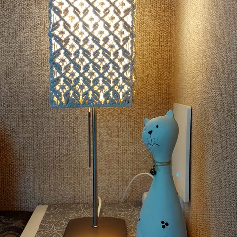 Pieni pöytävalaisin, metallinen jalka. Varjostin itsetehty käsityönä makrameetekniikalla, väri luonnonvalkoinen.