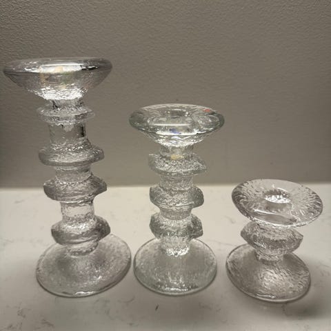 Iittalan kynttilänjalat, kahdessa 2/4 solmuisissa pohjassa signeeraus TS (Sarpanevan Timppa).