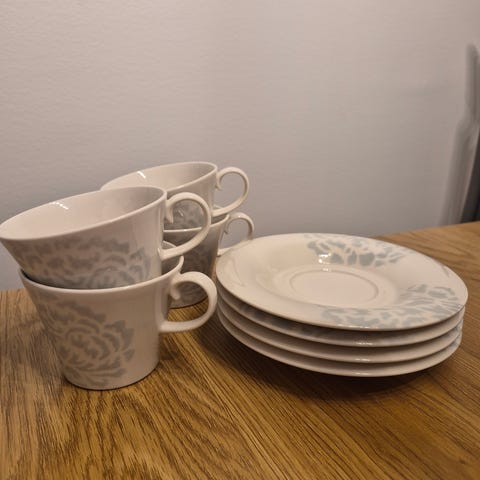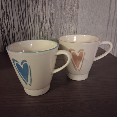 Kauniit kupit keltaisella aurinko kukalla, molemmin puolin sama kuvio. Vähäisellä käytöllä. Ehjät, vähäinen käytön jälki.