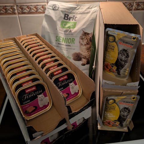 Muutaman kerran otettu kuivaruokaa. Säilytetty kuivassa ja sisätiloissa.