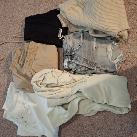 Hyväkuntoisia vaatteita, suurin osa ollut käytössä 150cm-155cm tytöllä, vihreät legginssit kokoa 164cm.