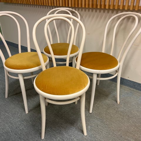 Kauniit, vanhat wieniläistuolit pehmustetuilla istuimilla. Kankaat hyvässä kunnossa ja tuolit ovat tukevat. Maalipinnassa jonkin verran ajan tuomaa kulumaa, yleisilme siisti.