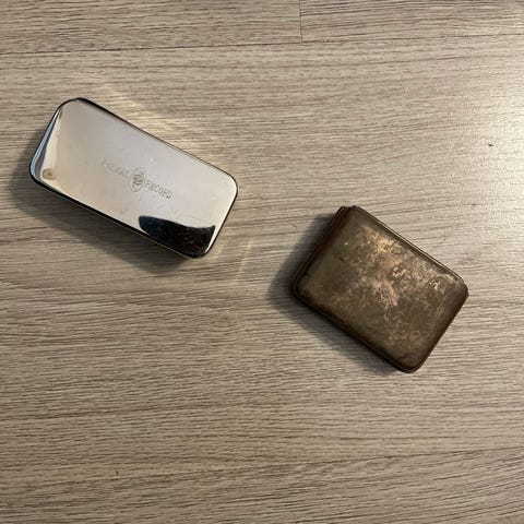 Tinarasia Norjasta. Käy esim. Korurasiaksi. Sisäosa kangasta. Hienosti koristeltu.