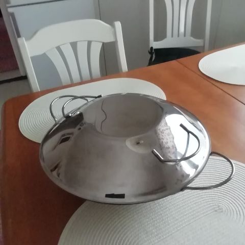 IKEA wokkipannu, jossa on puukahva. Pannu on musta ja valmistettu metallista. Soveltuu ruoan paistamiseen keittiössä.Halkaisia 35cm,käytetty kerran.