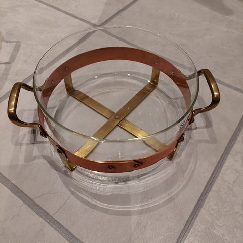 Nilsjohanin savulasinen uunivuoka. Vuoan tilavuus on kaksi litraa. Mukana kuparia ja messinkiä oleva tarjoiluteline. Lähes käyttämätön.