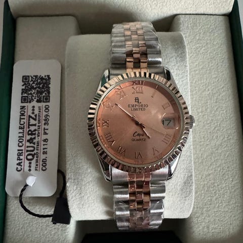 Emporio Limited naisten rannekello, jossa on kultainen väri ja koristeelliset kivet kellotaulun ympärillä. Kellossa on roomalaiset numerot ja metalliranneke. Uusi käyttämätön , suojamuovit päällä.