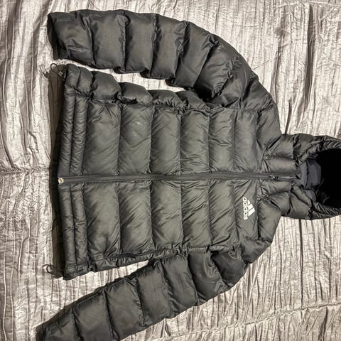 Adidaksen viininpunainen/burgundy(kuvissa valo vääristää takin väriä hiukan) toppatakki, koko L. Vetoketju ja nappikiinnitys, vetoketjulliset sivutaskut+povitasku.