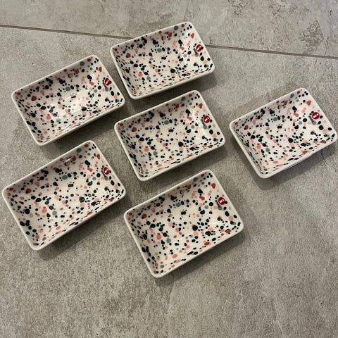 Oiva Toikka collectionin tarjoilulautanen alkuperäisessä pahvikääreessään. Pilkut sinisen/punaisen/keltaisen sävyisiä.