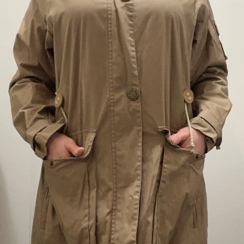 Kunto on erinomainen, ainoa moite löytyy oikean hartian kohdalta sisäpuolelta johon on jäänyt tummasta henkarista jälki (tarinan opetus: älä kuivaa vaaleaa vaatetta tummassa puuhenkarissa). Tämä jälki ei näy ulospäin mitenkään mutta huomioitu hinnassa.