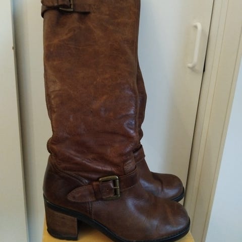 Lähes uudenveroiset nahkasaappaat,mukavat ja tukevat jalassa,normaali lesti. Koko kengässä on 40,mutta ovat enemmän 39 koolle hyvät. Varrensuun leveys 20cm. Voi hieman kiristää tai löysätä. Varren korkeus koron päältä 40cm. Vuori on kevyesti topattu pehmeä kangas. Tästä hyvät saappaat,itselle naftit.