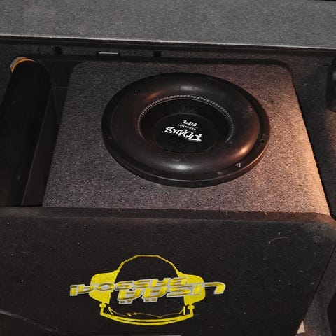 MDS Subwoofer -kaiutinkotelo, musta materiaali, sopii auton äänentoistojärjestelmään.