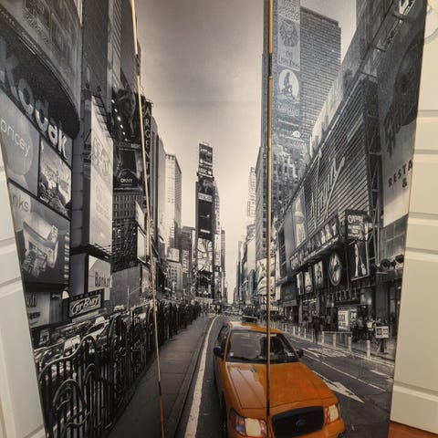 Kolmiosainen canvas-sermi, sermin koko 180×120. Kaksipuolinen kuva. Saanut vähän osumaa ajan saatossa, mutta yleisilme siisti. Kevyt siirettävä. Nouto Nurmo.