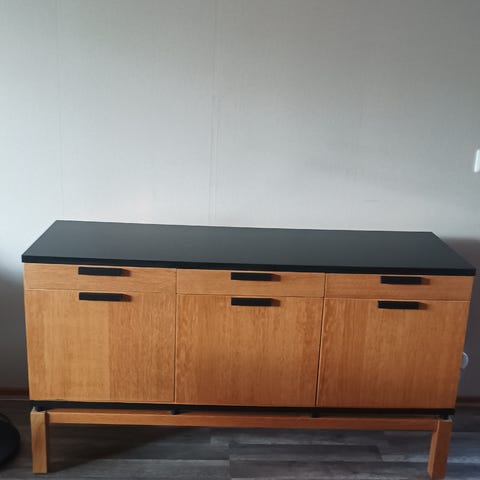 Kaunis, kunnostusta vaativa, Suomessa tehty senkki. Takaseinään on liimattu BB/WG:n tarra. Maalipinta ja kansi vaativat kunnostusta mielestäni ja toisen ulosvedettävän tason vetimestä puuttuu rengas. Laatikot ja tasot liukuvat hyvin ja kaapin sisusta on tosi siisti ikäisekseen. Kaappi ei haise miltään ja on ollut vain lämpimässä ja sisäilmaltaan terveessä talossa.