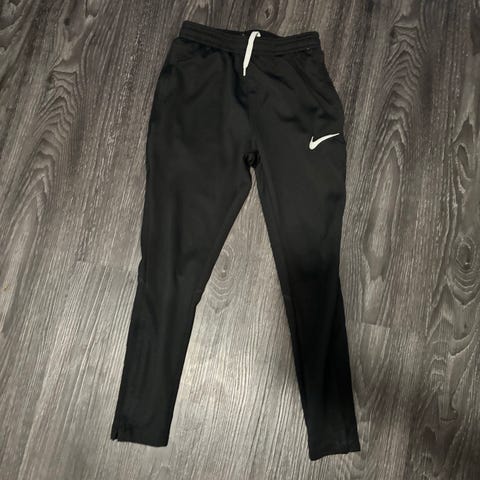 Nike lasten jalkapallohousut, koko 128. Mustat housut on valmistettu Dri-FIT-materiaalista, joka on suunniteltu urheilukäyttöön ja tarjoaa hyvän kosteudenhallinnan. Housuissa on joustava vyötärö ja vetoketjut lahkeensuissa helpottamaan pukemista.