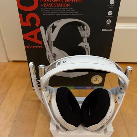 Logitech Asto a30 langattomat kuulokkeet mustalla värillä. Mukana kova kantokotelo ja lisävarusteita. Korvatyynyt on vaihdettu uusin pehmeisiin keelityynyihin, mukaan myös alkuperäiset. Niin kuin kuvista näkyy kumi irronnut headsetistä en ole vaivautunut laittamaan paikallee, ei haittaa toimivuutta mitenkään.