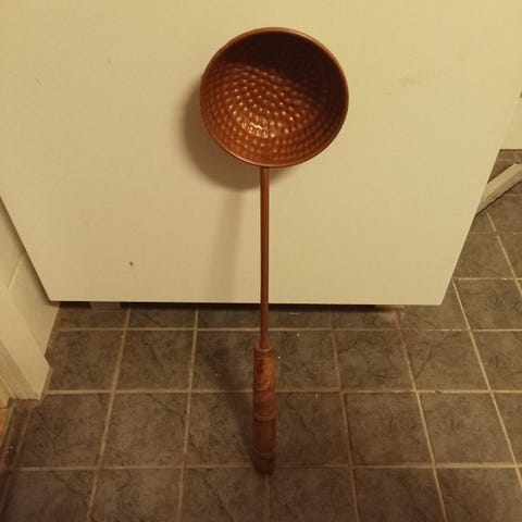 Perinteinen saunakauha kuparia. Pituus 43 cm. Käteen sopiva yksinkertainen muotoilu. Puukahvan pituus 18,6 cm. Saunakauha ei ole uusi, mutta käyttämätön. Nouto tai postitus.