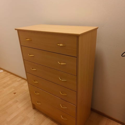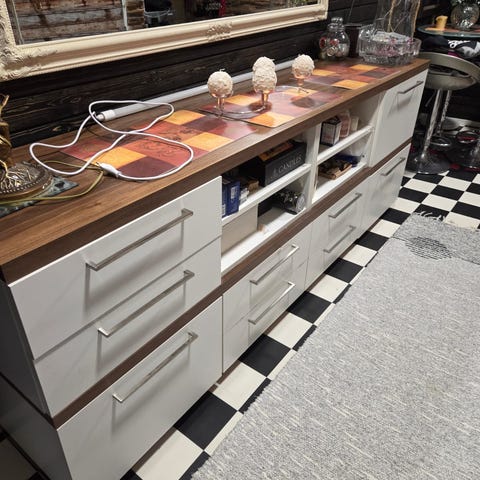 Myydään hieno lipasto sisustusliikkeestä: Kaikki laatikot kaipaa pohjan vahvistuksen kun ovat lähteneet irti.