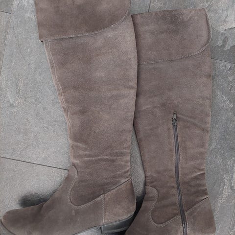 Ihanat tuhkanharmaat mokkanahkaiset saappaat. Varren pituus kantapäästä 48 cm. Siistit ja hyvin istuvat. Myyn ulkomaille muuton vuoksi.