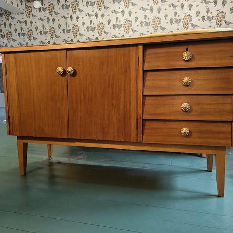 Maalattu kalkkimaalilla ja käsitelty kalustevahalla, joka tekee maalipinnasta kestävämmän. Sisus maalattu valkoisella maalilla. Laatikot jätetty alkuperäisiksi, todella siistissä kunnossa.