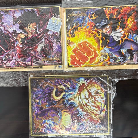 Setti One Piece-shikishejä. Kaikki hyväkuntoisia. Normaalikokoista shikishiä reilusti suurempia, mitat n. 27x24cm Hinta setiltä, voidaan myydä myös erikseen 5€/kpl.