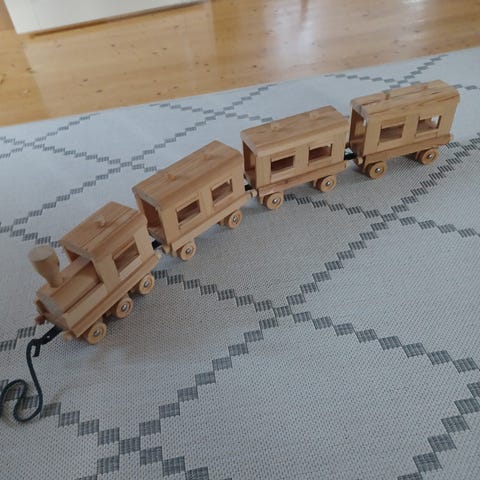 Käsityönä tehty juna: veturi, matkustajavaunu, tavaravaunu, avovaunu ja täysi tukkivaunu. Ovet liikkuvat samoin avovaunun välilevy. Valmistaja Keravan työkeskus. Korkeus n. 17 cm, veturin pituus 24 cm, tukkivaunun pituus 31 cm. Ehjä ja siisti, vähäisiä leikin jälkiä. Nouto tai postitus.