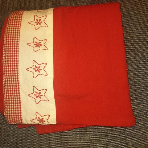 Punainen joulupukkikuvioilla oleva kappaverho. Koko 140cm 37cm. Itse tehty ja tämä käyttämätön.