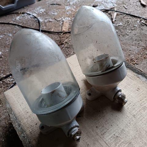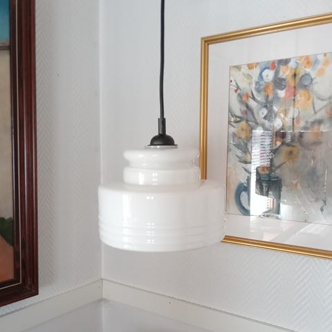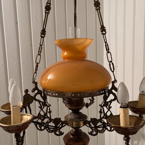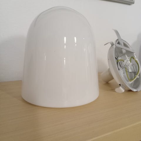 Vanha valaisin, lasia ja metallia. Irrotettava kupu. E14-kanta. Korkeus 34 cm.
