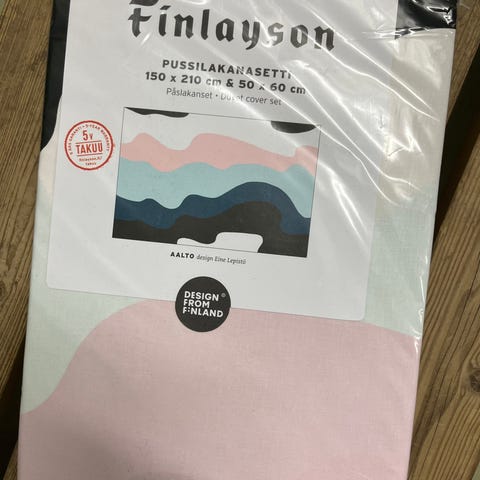 Myynnissä kuvassa oleva avaamaton pakkaus Finlaysonin valmistama Aalto pussilakana 150x210cm ja tyynyliina 55x65cm,setti on 100% puuvillaa,sini-valko sävyinen.Todella kaunis ja laadukas pussilakana+tyynyliina setti.
