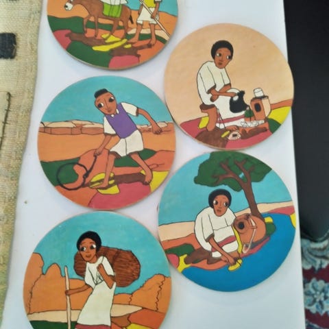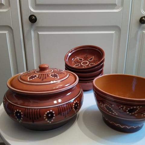 Käsintehtyä keramiikkaa Etelä-Afrikasta,lasitus. Sis. Kannu(vetoisuus 5 dl)sokerikko,2 tee/kahvikuppia(vetoisuus 2 dl),4 lautasta(halkaisija 18 cm)kaikissa lautasissa eri kuvio. Täysin uuden kuntoiset(käytetty pari kertaa). Tuotu itse maahan.