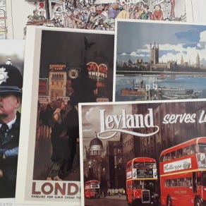1) Lontoon postikortit; 3 tyhjää ja yksi kulkenut kortti;